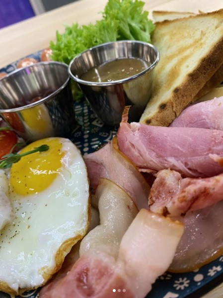 Яєчня, сосиски, бекон, шинка, мікс салату, томати чері гриль, обсмажені печериці, мікрогрін, сир чедер, тост пшеничний