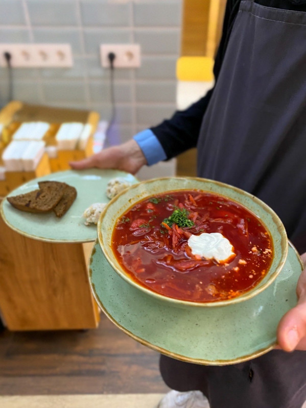 Борщ, пюре, шніцель, салат із синьої капусти, компот, хліб