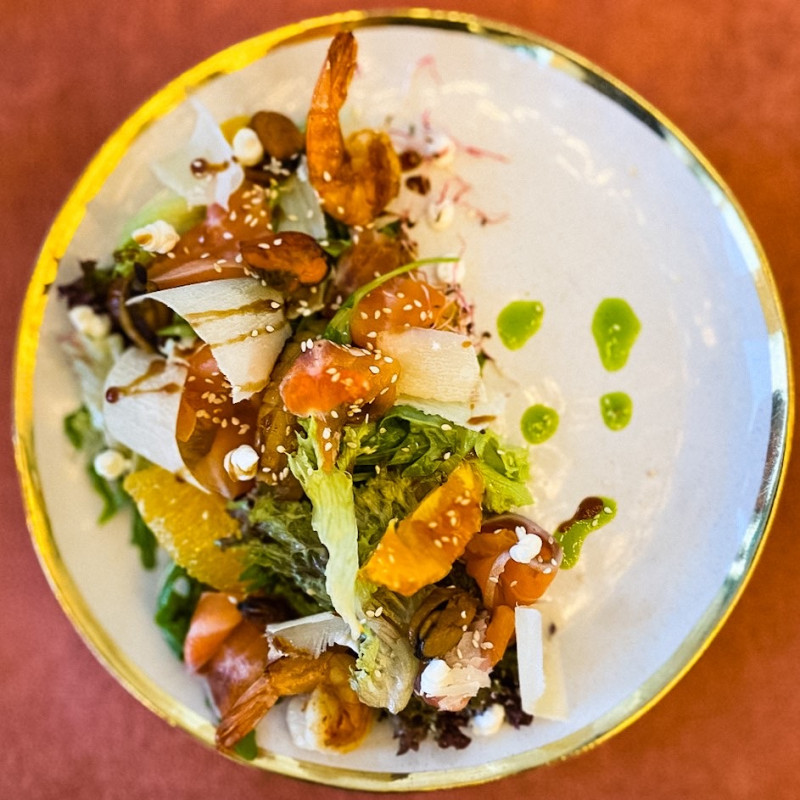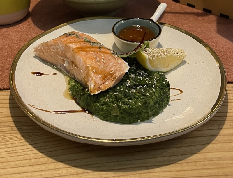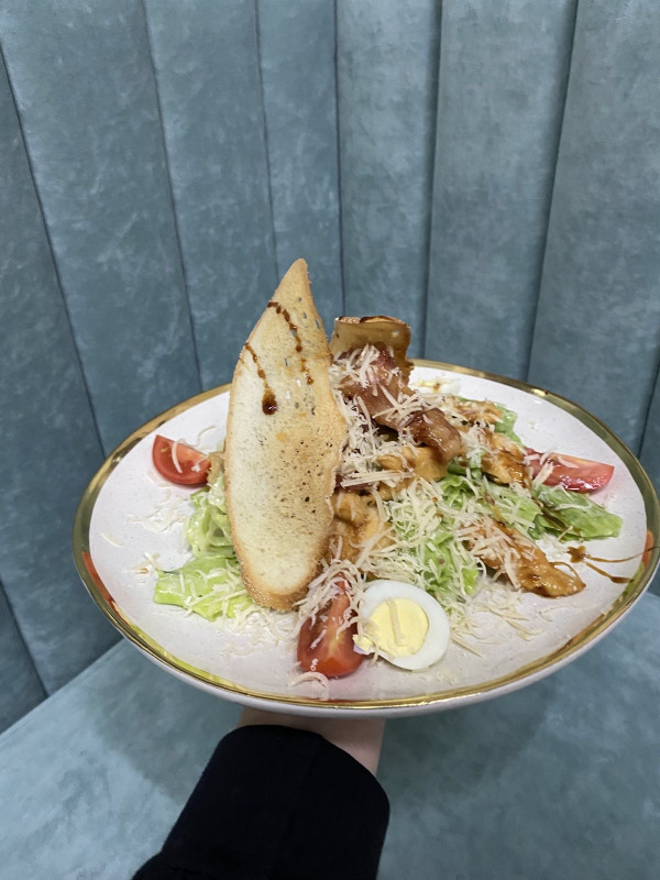 Лосось с/с, часник, мікс салату, пармезан, помідор, крутони, соус, перепелине яйце