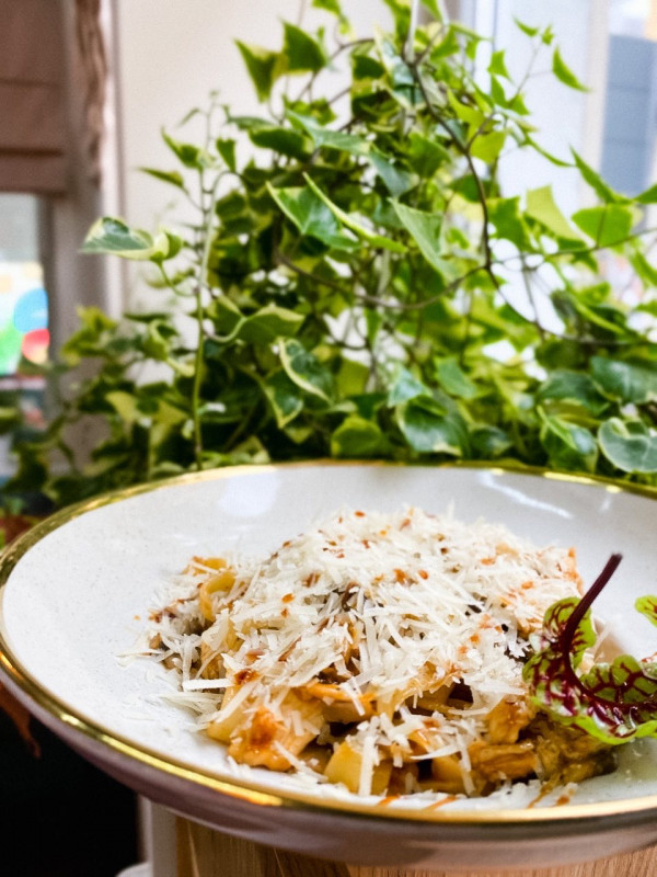 Прошуто, вершки, базилік, сир пармезан, яйце перепелине